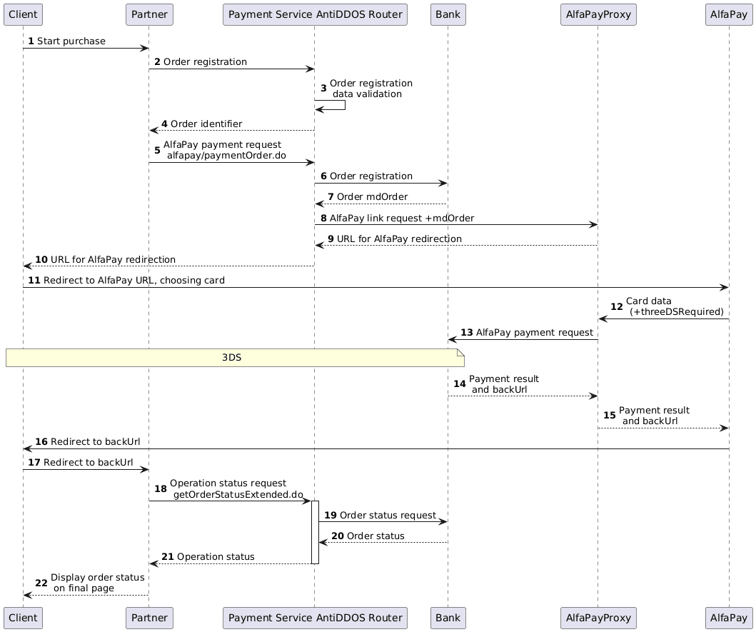 }'6. The Payment service AntiDDOS Router registers the order with the bank intended for Alfa Pay.