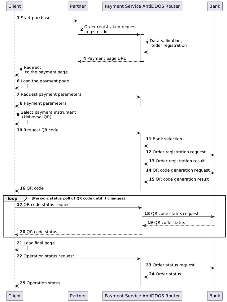 20. The Payment Service AntiDDOS Router sends the QR code status to the Client on the payment page. If the status remains unchanged, return to step 18. If the status changes — proceed to step 21.