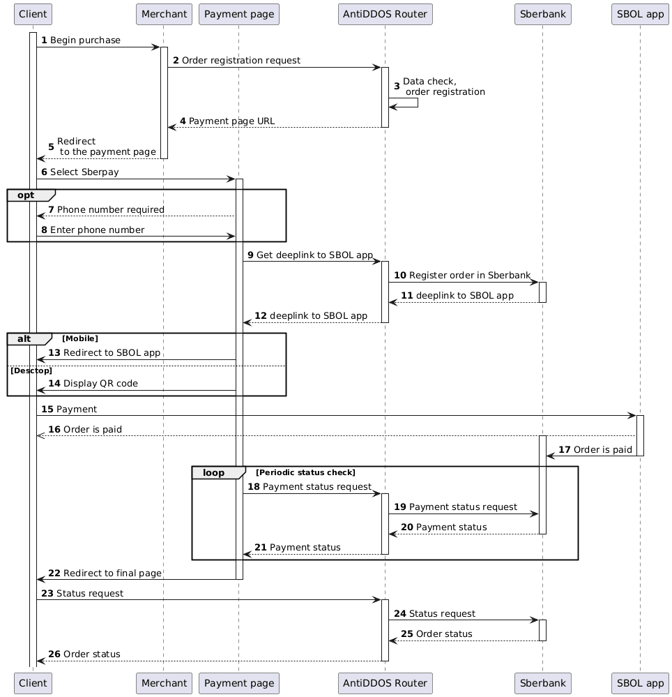 18-22. The payment page periodically requests the payment status from the payment service while the Client makes a payment through Sberbank Online on their device. When the payment status changes, the payment page redirects the Client to the final page. Depending on the payment result, this is either the failUrl or the returnUrl.