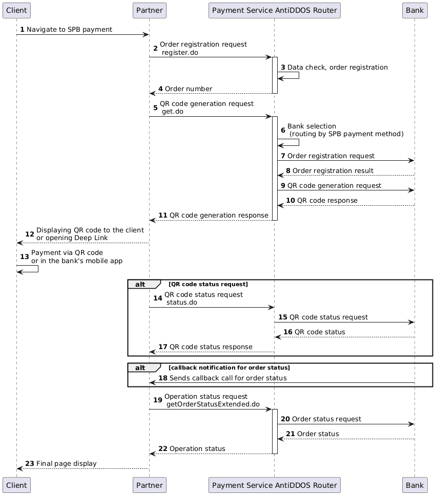 2. The Partner sends an order registration request to the Payment Service AntiDDOS Router: register.do for one-stage payment or registerPreAuth.do for two-stage payment. Peculiarities of two-phase payments via SBP are described in Two-phase payments with SBP.