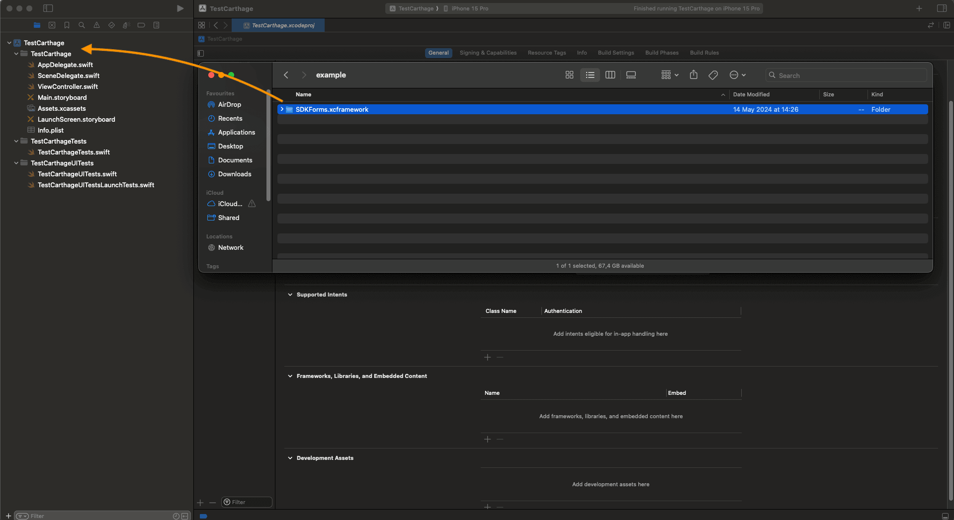 SDKCore.frameworkandSDKForms.framework, in the Embed column, changeDo not EmbedtoEmbed & Sign.
